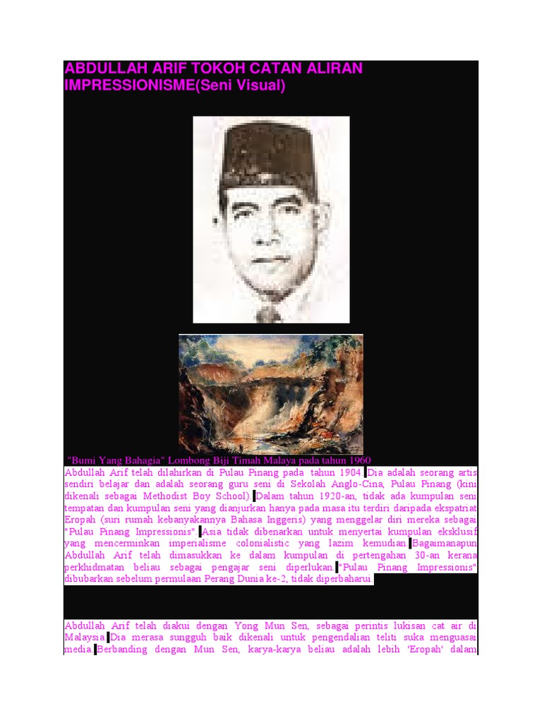 Perjuangan doktor penciptaan seni dan desain di semua perguruan tinggi di indonesia. 2 tokoh tempatan abdullah arif tokoh catan aliran impressionisme. Hijrah ke malaysia pada tahun 1947.